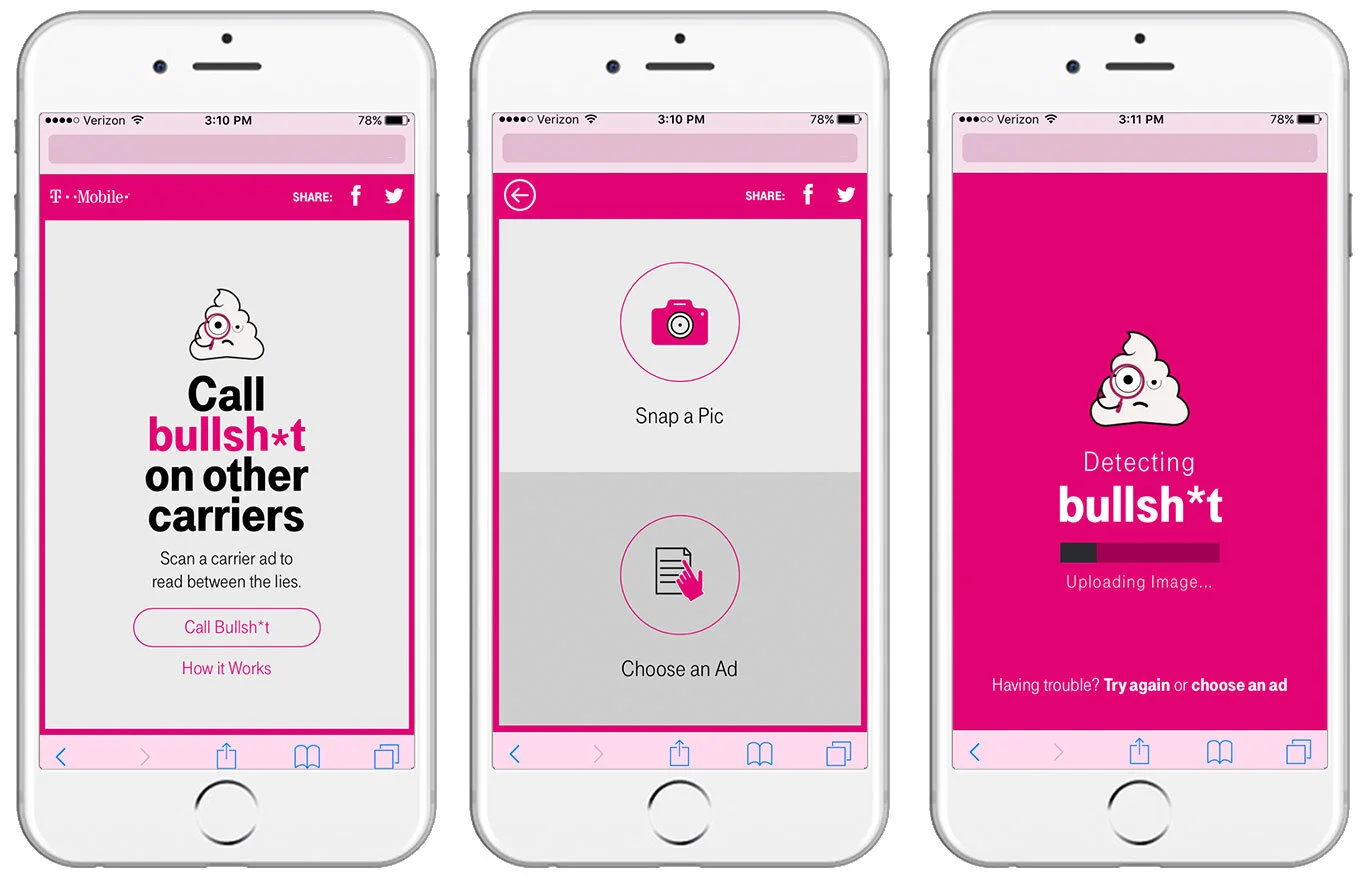 The T-Mobile ‘Bullsh*t Detector’, a mobile web-app that magically exposed the deceptive claims and misleading statements made in T-Mobile's competitors’ ads. Simply snap a photo and the advanced bullsh*t recognition technology does the rest.